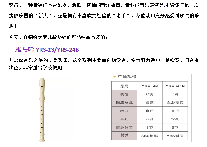 指法系統:德式(YRS-23)和巴洛克式(YRS-24B);吹口:直形